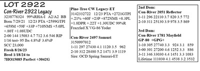 3238776323 98%RHA-I A2/A2 AA Born 7/28/21 12/23 PTA +2541GTPI +1640M +48F +43P +709NM$ +4.6PL +.12T +.92UDC +.22FLC 2-00 149 16279 3.2 519 2.9 465 RIP 1/16 test- 97 lbs 3.4%F 2.7%P SCC 15,000 Fresh 8/21/23