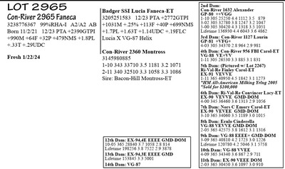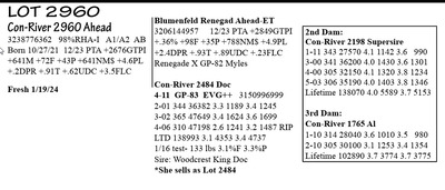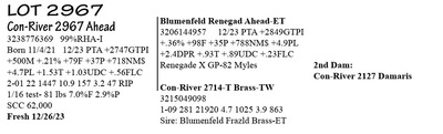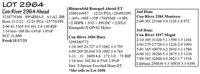 3238776370 99%RHA-I A1/A1 BB Born 11/6/21 12/23 PTA +2595GTPI +503M +40F +33P +573NM$ 2-01 12 579 6.2 36 3.8 22 RIP 1/16 test- 64 lbs 5.8%F 3.5%P SCC 54,000 Fresh 1/5/24