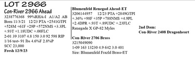 3238776366 99%RHA-I A1/A2 BB Born 11/2/21 12/23 PTA +2577GTPI 2-00 61 5365 9.0 481 2.6 140 RIP 1/16 test- 109 lbs 4.6%F 3.0%P SCC 31,000 Fresh 11/17/23