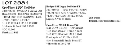 3238776383 99%RHA-I A2/A2 AB Born 12/4/21 12/23 PTA +2620GTPI +402M +70F +33P +649NM$ +4.6PL +.70T +.59UDC +.05FLC 1-11 50 3926 4.5 175 3.3 129 RIP 1/16 test- 84 lbs 4.2%F 3.1%P SCC 41,000 Fresh 11/28/23
