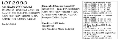 3238776391 99%RHA-I A1/A2 BE Born 12/15/21 12/23 PTA +2798GTPI +1287M +84F +54P +736NM$ +2.5PL +2.28T +1.91UDC +1.37FLC 1-11 38 3260 5.6 181 2.9 96 RIP 1/16 test- 102 lbs 5.3%F 2.8%P SCC 31,000 Fresh 12/10/23