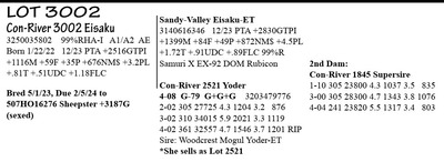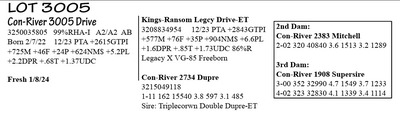 3238776400 98%RHA-I A2/A2 AA Born 1/4/22 12/23 PTA +2466GTPI +389M +65F +30P +453NM$ +1.4PL +1.33T +.84UDC -.06FLC 1-11 40 3020 4.7 143 3.0 90 RIP 1/16 test- 86 lbs 4.5%F 2.8%P SCC 18,000 Fresh 12/8/23