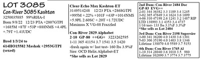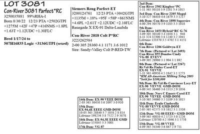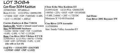 3250035884 99%RHA-I Born 9/3/22 12/23 PTA +2699GTPI +1746M +82F +53P +748NM$ +3.6PL +.81T +1.39UDC +.40FLC Carries Embryo & Due 7/18/24 Embryo ID: *made w/ female sexed semen Sire: 507HO16485 Sundance +3240G +803M +106F +53P +1246NM$ +8.6PL +2.0PL +1.76T +2.25UDC Dam: Con-River 3014-T Deluxe-ET*CD 3250035814 12/23 PTA +3087G +1795M +109F +65P +1079NM$ +5.6PL +2.10T (she sells as Lot 15) (calf PA = +3164GTPI +1163NM$ +1299M +108F +59P +2.18T)