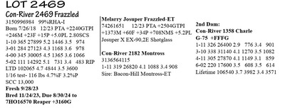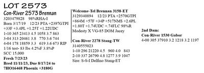 3203479814 99%RHA-I Born 2/9/19 12/23 PTA +2335GTPI +244M +33F +25P +2.5PL +1.50T 2-00 305 27853 3.7 1026 3.4 938 3-00 365 35664 4.5 1610 3.6 1268 4-07 105 13303 4.0 532 3.3 437 RIP 1/16 test- 124 lbs 4.2%F 3.1%P SCC 57,000 Fresh 10/4/23 Bred 12/1/23, Due 9/6/24 to 7HO16485 Sundance +3240G