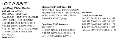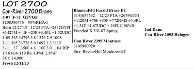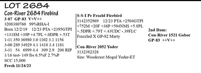 3-06 GP-83 V+V++ 3215049095 99%RHA-I Born 1/23/20 12/23 PTA +2526GTPI +388M +52F +37P +559NM$ +2.4PL 1-10 321 27397 4.5 1236 3.7 1022 2-11 280 29453 5.0 1459 3.6 1071 3-10 42 3919 4.2 165 2.8 109 RIP 1/16 test- 92 lbs 4.0%F 2.6%P SCC 19,000 Fresh 12/6/23
