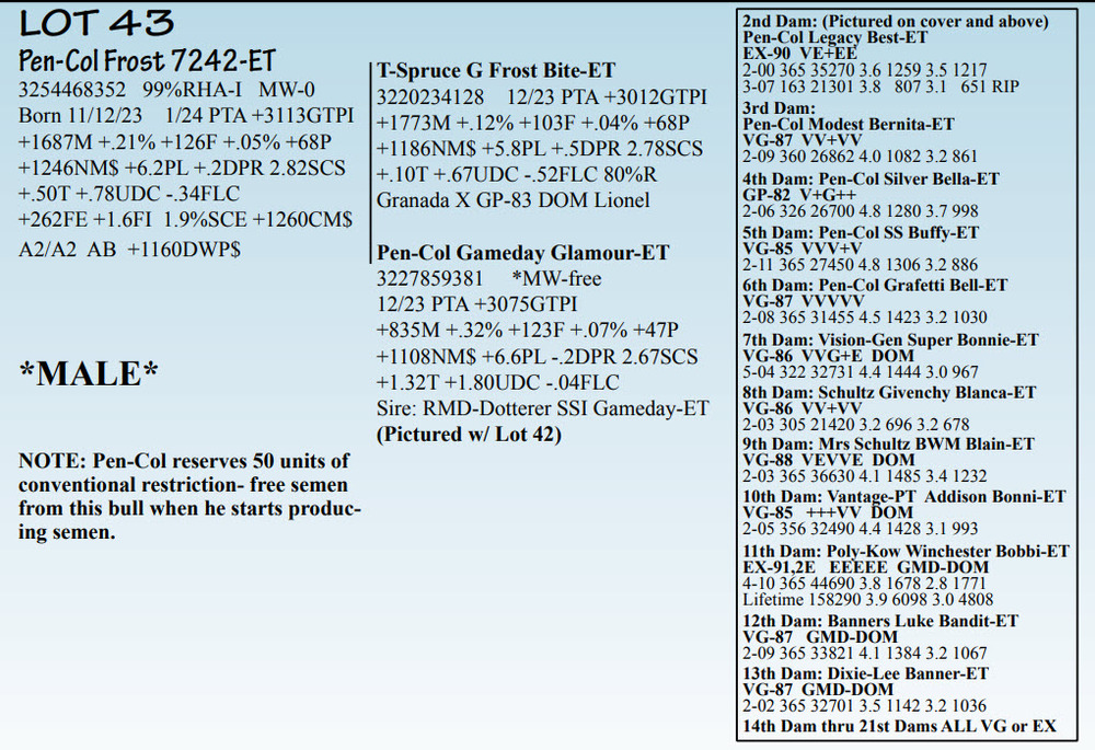 NOTE: Pen-Col reserves 50 units of conventional restriction- free semen from this bull when he starts producing semen.