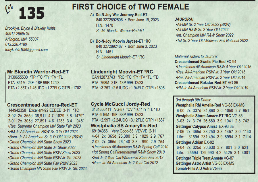 FIRST CHOICE of TWO FEMALE A) Do-N-Joy War Journey-Red-ET 840 3272892506 Born June 19, 2023 H.N. 1470 S: Mr Blondin Warrior-Red-ET B) Do-N-Joy Moovin Jaycee-ET *RC 840 3272892487 Born June 3, 2023 H.N. 1451 S: Lindenright Moovin-ET *RC