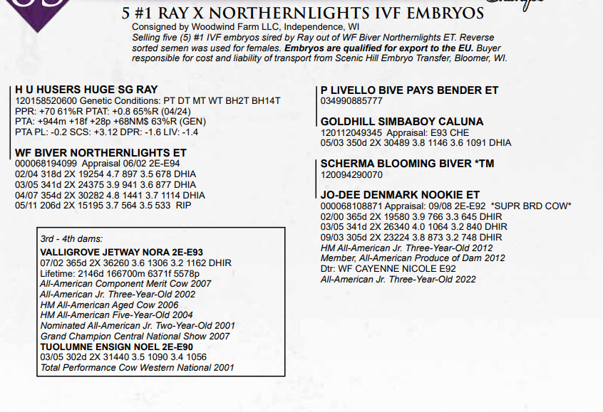 Selling five (5) #1 IVF embryos sired by Ray out of WF Biver Northernlights ET. Reverse