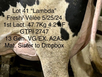 ENREG: 840003240291517 PERE: LAMBDA Lactation #: 1 LAIT KG: 47.7272727272727 SCC: 13 REPRO: FRAICHE NEE: 6/ 3/22 PEDIGREE: LAMBDA mat sister to DROPBOX - EX 91 Casper x EX 92 Delta Destiny 5 fils en IA x EX 94 Doorman x EX 94 Dorcy Dextra x 9 gen VG or EX VELEE: 5/25/24