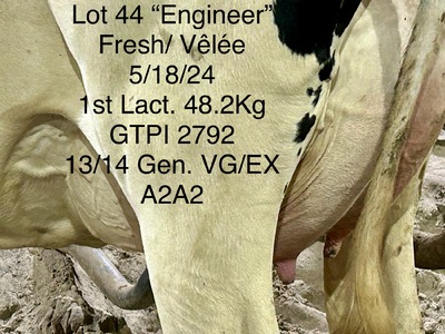 ENREG: 840003240291564 PERE: ENGINEER Lactation #: 1 LAIT KG: 48.1818181818182 SCC: 50 REPRO: FRAICHE NEE: 7/ 4/22 PEDIGREE: VG 86 Mick x EX Imax x EX 91 Supershot x NC Oak x EX 94 Dorcy Dextra x 9 gen VG or EX VELEE: 5/18/24