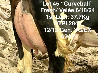 ENREG: 840003240291585 PERE: CURVEBALL Lactation #: 1 LAIT KG: 37.7272727272727 SCC: 13 REPRO: FRAICHE NEE: 7/21/22 PEDIGREE: GP 82 Crane x VG Achiever x VG 88 Detour x Ex 93 Kingboy x 9 gen VG or EX VELEE: 6/18/24