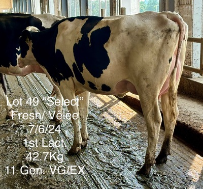 ENREG: 840003240291608 PERE: SELECT Lactation #: 1 LAIT KG: 42.7272727272727 SCC: 22 REPRO: FRAICHE NEE: 8/ 8/22 PEDIGREE: VG 87 Hiphop x VG 88 Olympian x EX 95 Mogul Cleo x 8 gen EX Roxy's VELEE: 7/ 6/24