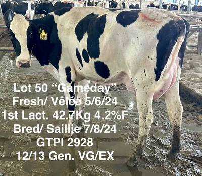 ENREG: USA003240588640 PERE: GAMEDAY Lactation #: 1 LAIT KG: 42.7272727272727 SCC: 38 REPRO: SAILLIE NEE: 4/12/22 PEDIGREE: GP 83 Eisaku x VG 87 Resolve x VG 86 x VG 88 Monterey x EX 91 x VG 88 MOM Halo x 7 gen VG or EX Saillie x Shetek Sexée 3225 GTPI 1163 GNM$ VELEE: 5/ 6/24