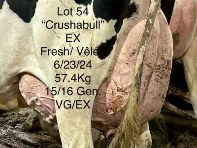 ENREG: 124000111453750 PERE: CRUSHABULL Lactation #: 4 LAIT KG: 57.4 SCC: 7 REPRO: FRAICHE NEE: 05/09/19 PEDIGREE: EX Crushabull x NC Expander x VG Doorman x VG 88 1* Fever x VG 86 Durham x 12 gen VG or EX Reserve Grand Champion Richmond 2022 VELEE: 06/23/24