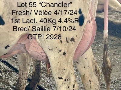 ENREG: USA003240588913 PERE: CHANDLER Lactation #: 1 LAIT KG: 40 SCC: 20 REPRO: SAILLIE NEE: 6/30/22 PEDIGREE: Ex Merrimac x GP Frazzled x VG 86 Delta Saillie x ENDURANCE Sexée 3267 GTPI 1409 GNM$ fils de Garza x Captain VELEE: 4/17/24