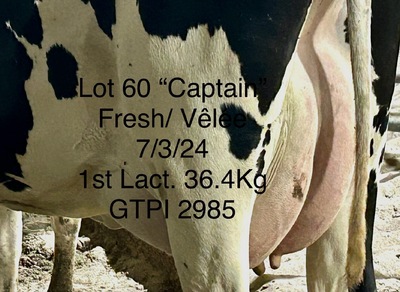 ENREG: USA003240588870 PERE: CAPTAIN Lactation #: 1 LAIT KG: 42.7272727272727 SCC: 50 REPRO: FRAICHE NEE: 6/18/22 PEDIGREE: GP 83 Brass x GP 83 Folklore x VG 88 Denver x 4 gen VG or EX VELEE: 5/16/24