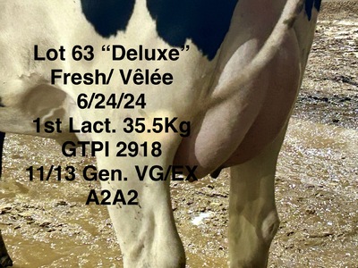 ENREG: USA003240589100 PERE: DELUXE Lactation #: 1 LAIT KG: 35.4545454545455 SCC: 37 REPRO: FRAICHE NEE: 8/16/22 PEDIGREE: G Riveting x GP Achiever x VG 86 Octoberfest x 10 gen VG or EX VELEE: 6/24/24