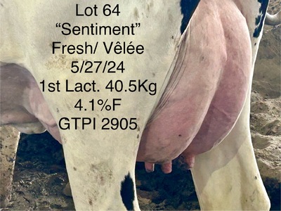 ENREG: USA003240589106 PERE: SENTIMEN Lactation #: 1 LAIT KG: 40.4545454545455 SCC: 22 REPRO: FRAICHE NEE: 8/17/22 PEDIGREE: G Riveting x GP 82 Jedi x 83 Denver x GP Midnight x Ex Custom x Ex 94 Ramo 1200 x Vg 87 x VG 86 VELEE: 5/27/24