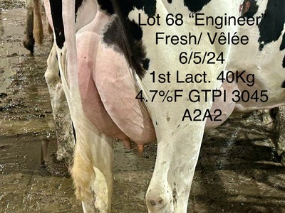 ENREG: USA003253769892 PERE: ENGINEER Lactation #: 1 LAIT KG: 40 SCC: 33 REPRO: FRAICHE NEE: 8/31/22 PEDIGREE: GP Zazzle x EX Riveting x GP 83 Ragen x GP Montross x GP 83 SS x VG x VG No Fla Ped VELEE: 6/ 5/24