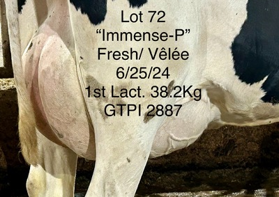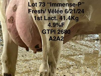 ENREG: USA003253769931 PERE: IMMENSEP Lactation #: 1 LAIT KG: 38.1818181818182 SCC: 66 REPRO: FRAICHE NEE: 9/12/22 PEDIGREE: NC Imperial x GP 83 Delta x NC Cashcoin x 6 gen VG or EX VELEE: 6/25/24