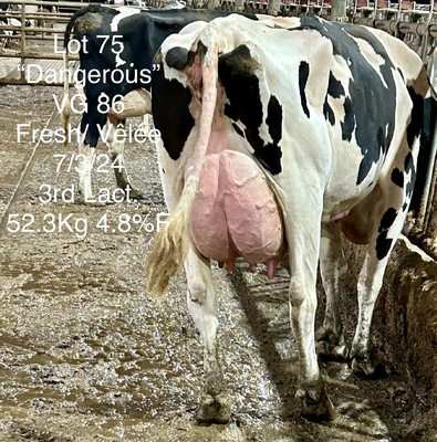 ENREG: 124000120335218 PERE: DANGEROUS Lactation #: 3 LAIT KG: 52.2727272727273 SCC: 108 REPRO: FRAICHE NEE: 08/02/20 PEDIGREE: VG 86 Dangerous x NC Trueshot x G Plentiful VELEE: 07/03/24