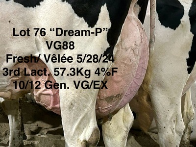ENREG: 840003206964106 PERE: DREAM P Lactation #: 3 LAIT KG: 57.2727272727273 SCC: 7 REPRO: FRAICHE NEE: 07/04/19 PEDIGREE: VG 88 Dream P x G Salvatore x GP 82 Boastful x 10 gen VG or EX VELEE: 05/28/24