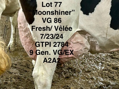 ENREG: 840003214541587 PERE: MOONSHINER Lactation #: 2 LAIT KG: 42.3 SCC: REPRO: FRAICHE NEE: 12/08/20 PEDIGREE: VG 86 2yr Moonshiner x VG 87 Capital x VG 88 Delta x VG 87 Cashcoin x 6 gen VG or EX VELEE: 07/23/24