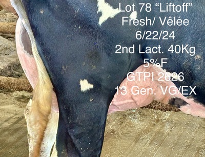ENREG: 840003132143917 PERE: LIFTOFF Lactation #: 2 LAIT KG: 40 SCC: 41 REPRO: FRAICHE NEE: 04/22/21 PEDIGREE: GP 82 Lift off x VG Riveting x VG Achiever x VG 88 Detour x EX 93 Kingboy x 9 gen VG or EX VELEE: 06/22/24