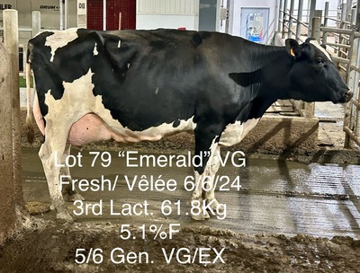 ENREG: 840003201202469 PERE: EMERALD Lactation #: 3 LAIT KG: 61.8181818181818 SCC: 57 REPRO: FRAICHE NEE: 11/06/19 PEDIGREE: VG Emerald x NC Draco x VG 87 SS x 4 gen VG or EX Bolton Misha Fam VELEE: 6/ 6/24