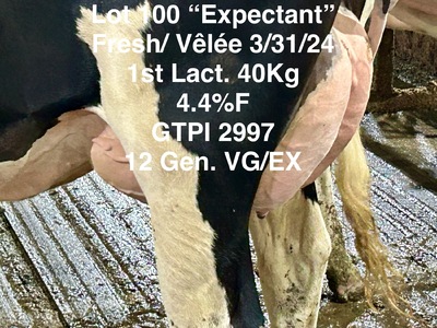 ENREG: 840003234746918 PERE: EXPECTANT Lactation #: 1 LAIT KG: 40 SCC: 13 REPRO: SAILLIE NEE: 3/21/22 PEDIGREE: Ex Zasberilla x VG Jared x EX Delta Habitan x VG 88 Day x VG 88 MOM Halo x 7 gen VG or EX Saillie x Parment 3116 GTPI 975 GNM$ 2.41 PTAT 2.63 UD VELEE: 3/31/24