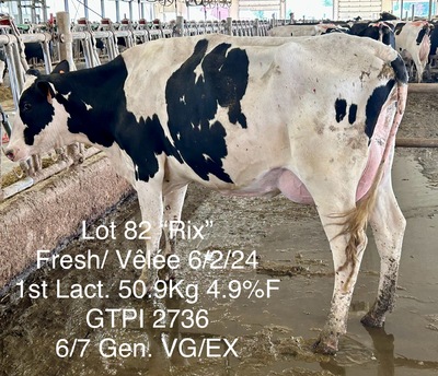 ENREG: 840003217449077 PERE: RIX Lactation #: 1 LAIT KG: 50.9090909090909 SCC: 57 REPRO: FRAICHE NEE: 6/ 3/22 PEDIGREE: GP 84 Hotline x EX 91 Rubicon x 5 gen VG or EX Bolton Misha Fam VELEE: 6/ 2/24