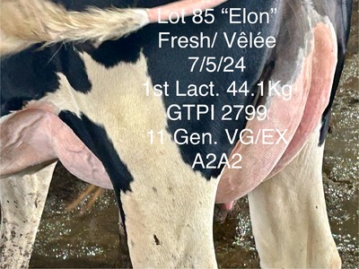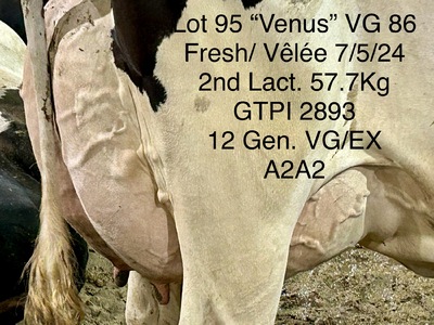 ENREG: 840003214489013 PERE: VENUS Lactation #: 2 LAIT KG: 55 SCC: 41 REPRO: FRAICHE NEE: 6/20/21 PEDIGREE: VG Venus x VG 88 Positive x EX Delta Habitan (16 fils en IA) x VG 88 Day x VG 88 MOM Halo x 7 gen VG or EX VELEE: 6/22/24