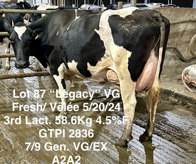ENREG: 840003210341011 PERE: LEGACY Lactation #: 3 LAIT KG: 58.6363636363636 SCC: 19 REPRO: FRAICHE NEE: 12/23/19 PEDIGREE: VG Legacy x NC Yoda x NC Hurricane x 7 gen Vg or EX to Chief Adeen VELEE: 5/20/24