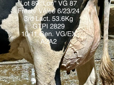 ENREG: 840003214487784 PERE: LON Lactation #: 3 LAIT KG: 53.6363636363636 SCC: 13 REPRO: FRAICHE NEE: 8/27/20 PEDIGREE: VG 87 Lon x GP 82 Maverick x EX Delta Habitan (16 fils en IA) x VG 88 Day x VG 88 MOM Halo x 7 gen VG or EX VELEE: 6/23/24