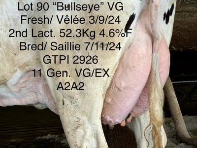 ENREG: 840003214488666 PERE: BULLSEYE Lactation #: 2 LAIT KG: 52.2727272727273 SCC: 13 REPRO: SAILLIE NEE: 3/28/21 PEDIGREE: VG Bullseye x VG Positive x EX Delta Habitan x VG 88 Day x VG 88 MOM Halo x 7 gen VG or EX Saillie x Hardin sexée 3276 GTPI 1283 GNM$ 2.53 UDC VELEE: 3/ 9/24