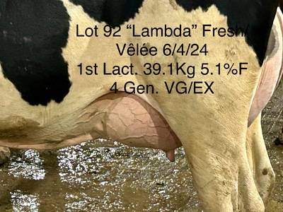 ENREG: 840003219944506 PERE: LAMBDA Lactation #: 1 LAIT KG: 39.0909090909091 SCC: 29 REPRO: FRAICHE NEE: 9/ 3/22 PEDIGREE: VG 88 Jacoby x EX 91 Dundee x EX 92 Durham x EX 93 Juror VELEE: 6/ 4/24