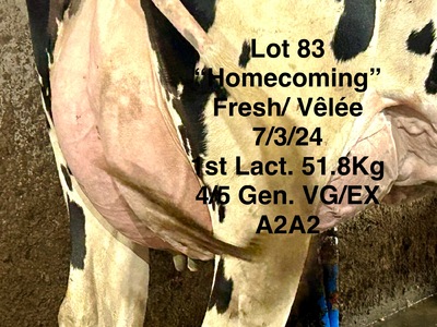 ENREG: 840003217449087 PERE: HOMECOMING Lactation #: 1 LAIT KG: 51.8181818181818 SCC: 22 REPRO: FRAICHE NEE: 7/21/22 PEDIGREE: NC Hancock x EX 91 Garcia x VG 86 Ramos x VG 86 x EX VELEE: 7/ 3/24