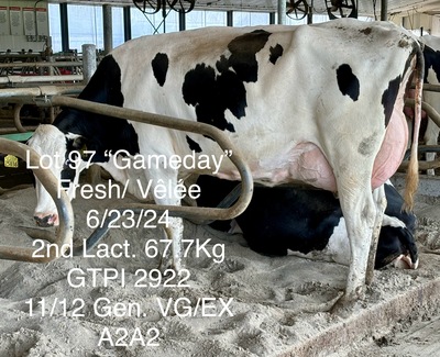ENREG: 840003214489081 PERE: GAMEDAY Lactation #: 2 LAIT KG: 67.7272727272727 SCC: 22 REPRO: FRAICHE NEE: 7/ 8/21 PEDIGREE: GP 82 Gameday x GP 83 Bundle x VG Frazzled x EX 91 Silver x VG 87 Jacey x VG 88 MOM Halo x 7 gen VG or EX VELEE: 6/23/24