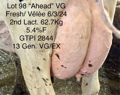ENREG: 840003214489177 PERE: AHEAD Lactation #: 2 LAIT KG: 62.7272727272727 SCC: 13 REPRO: FRAICHE NEE: 7/29/21 PEDIGREE: VG Ahead x VG Legacy x EX 91 Achiever x VG Charismatic x 10 gen VG or EX VELEE: 6/ 3/24