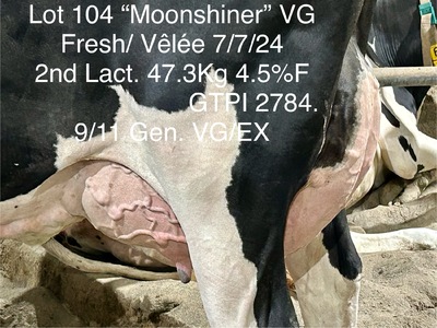 ENREG: 840003223868459 PERE: MOONSHINER Lactation #: 2 LAIT KG: 47.2727272727273 SCC: 47 REPRO: FRAICHE NEE: 01/09/21 PEDIGREE: VG 2Yr Moonshiner x G Lucia x NC Jedi x VG 86 Spring x VG Donatello x 7 gen VG or EX OCD ped VELEE: 07/07/24