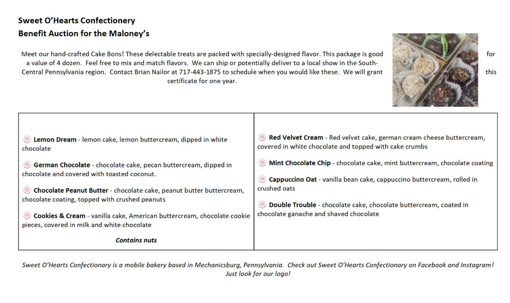 4 Doz. Cake Bons Donated by Brian Nailor Sweet O'Hearts Confectionery (717) 443-1875