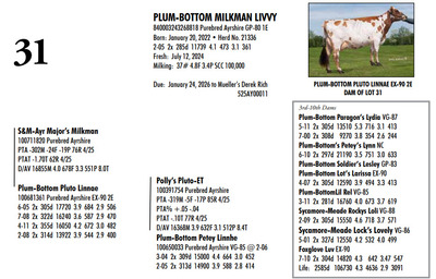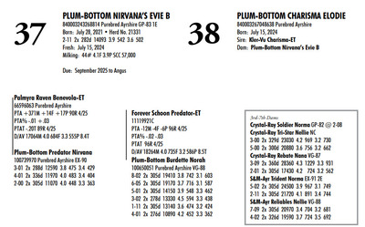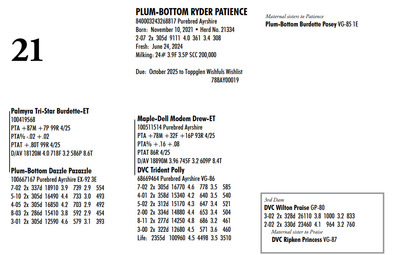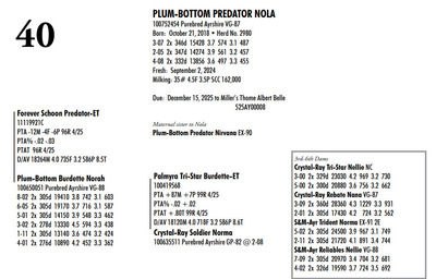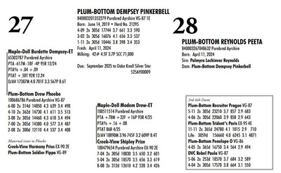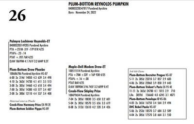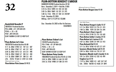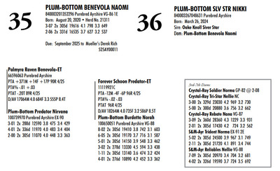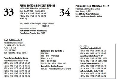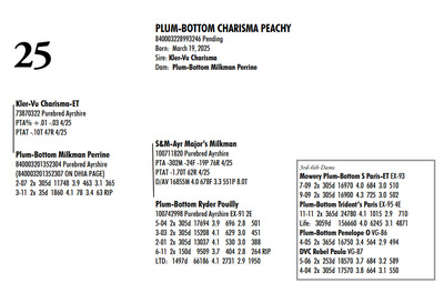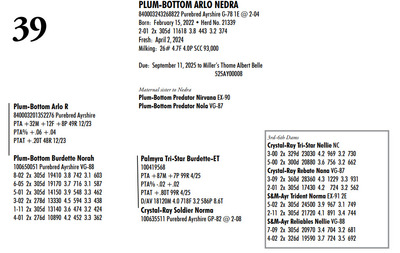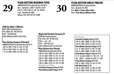 Plum Bottom Ayrshires Complete Herd Dispersal 6364 State Route 655, Belleville PA, 17004 100% Ayrshire Bred Herd Contact Agent: Aaron Ray 336-363-4639 Catalog | Terms of Auction Download CATALOG Download UPDATES Download SEMEN LIST Download SALE ORDER Catalog | Terms Download CATALOG Download UPDATES Download SEMEN LIST Download SALE ORDER All Items (77) Cattle (69) Semen (8) Categories All Items (77) Cattle (69) Semen (8) Search Item #: Keyword: Search Catalog Item #: Keyword: 20 items per page 50 items per page 100 items per page Go to page #: 1 , 2 , 3 , 4 #21 – PLUM-BOTTOM RYDER PATIENCE 840003243268817 Purebred Ayrshire Born: November 10, 2021 Herd No. 21334 2-07 2x 305d 9111 4.0 361 3.4 308 Fresh: June 24, 2024 Milking: 24# 3.9F 3.5P SCC 200,000 Due: October 2025 to Toppglen Wishfuls Wishlist 788AY Location: 6364 State Route 655, Belleville PA, 17004 Contact Agent: Aaron Ray 336-363-4639 More Info / Bid Now Track this Item Sold High Bid: $2,700.00 – #44 #21 – PLUM-BOTTOM RYDER PATIENCE Sold High Bid: $2,700 More Details More Info / Bid Track Item 840003243268817 Purebred Ayrshire Born: November 10, 2021 Herd No. 21334 2-07 2x 305d 9111 4.0 361 3.4 308 Fresh: June 24, 2024 Milking: 24# 3.9F 3.5P SCC 200,000 Due: October 2025 to Toppglen Wishfuls Wishlist 788AY Location: 6364 State Route 655, Belleville PA, 17004 Contact Agent: Aaron Ray 336-363-4639 #22 – PLUM-BOTTOM RYDER POUILLY 100742998 Purebred Ayrshire EX-91 2E Born: December 18, 2017 Herd No. 2969 5-04 2x 305d 17694 3.9 696 2.8 501 3-03 2x 305d 15208 4.1 629 3.0 451 2-01 2x 305d 13037 4.1 530 3.0 388 6-11 2x 150d 9509 3.7 404 2.8 264 RIP LTD: 1497d 66186 4.1 2731 2.9 1950 Fresh: November 24, 2024 Milking: 52# 2.6F 2.8P SCC 87,000 Location: 6364 State Route 655, Belleville PA, 17004 Contact Agent: Aaron Ray 336-363-4639 More Info / Bid Now Track this Item Sold High Bid: $2,700.00 – #4 #22 – PLUM-BOTTOM RYDER POUILLY Sold High Bid: $2,700 More Details More Info / Bid Track Item 100742998 Purebred Ayrshire EX-91 2E Born: December 18, 2017 Herd No. 2969 5-04 2x 305d 17694 3.9 696 2.8 501 3-03 2x 305d 15208 4.1 629 3.0 451 2-01 2x 305d 13037 4.1 530 3.0 388 6-11 2x 150d 9509 3.7 404 2.8 264 RIP LTD: 1497d 66186 4.1 2731 2.9 1950 Fresh: November 24, 2024 Milking: 52# 2.6F 2.8P SCC 87,000 Location: 6364 State Route 655, Belleville PA, 17004 Contact Agent: Aaron Ray 336-363-4639 #23 – PLUM-BOTTOM BENEVOLA PRUNELLE 840003201352291 Purebred Ayrshire VG-86 1E Born: February 16, 2020 Herd No. 21306 2-02 2x 305d 14008 3.9 547 3.2 441 4-04 2x 311d 16502 4.0 656 3.2 535 3-04 2x 285d 9213 4.0 373 3.4 317 RIP Fresh: June 16, 2024 Milking: 37# 4.3F 3.5P Location: 6364 State Route 655, Belleville PA, 17004 Contact Agent: Aaron Ray 336-363-4639 More Info / Bid Now Track this Item Sold High Bid: $2,800.00 – #1024 #23 – PLUM-BOTTOM BENEVOLA PRUNELLE Sold High Bid: $2,800 More Details More Info / Bid Track Item 840003201352291 Purebred Ayrshire VG-86 1E Born: February 16, 2020 Herd No. 21306 2-02 2x 305d 14008 3.9 547 3.2 441 4-04 2x 311d 16502 4.0 656 3.2 535 3-04 2x 285d 9213 4.0 373 3.4 317 RIP Fresh: June 16, 2024 Milking: 37# 4.3F 3.5P Location: 6364 State Route 655, Belleville PA, 17004 Contact Agent: Aaron Ray 336-363-4639 #24 – PLUM-BOTTOM MILKMAN PERRINE 840003201352304 Purebred Ayrshire (840003201352307 ON DHIA PAGE) Born: April 6, 2021 Herd No. 21325 2-07 2x 305d 11748 3.9 463 3.1 365 3-11 2x 35d 1860 4.1 78 3.4 63 RIP Fresh: March 19, 2025 Milking: 57# 3.9F 3.1P SCC 19,000 Location: 6364 State Route 655, Belleville PA, 17004 Contact Agent: Aaron Ray 336-363-4639 More Info / Bid Now Track this Item Sold High Bid: $3,100.00 – #8 #24 – PLUM-BOTTOM MILKMAN PERRINE Sold High Bid: $3,100 More Details More Info / Bid Track Item 840003201352304 Purebred Ayrshire (840003201352307 ON DHIA PAGE) Born: April 6, 2021 Herd No. 21325 2-07 2x 305d 11748 3.9 463 3.1 365 3-11 2x 35d 1860 4.1 78 3.4 63 RIP Fresh: March 19, 2025 Milking: 57# 3.9F 3.1P SCC 19,000 Location: 6364 State Route 655, Belleville PA, 17004 Contact Agent: Aaron Ray 336-363-4639 #25 – PLUM-BOTTOM CHARISMA PEACHY 840003228993246 Pending Born: March 19, 2025 Location: 6364 State Route 655, Belleville PA, 17004 Contact Agent: Aaron Ray 336-363-4639 More Info / Bid Now Track this Item Sold High Bid: $1,050.00 – #1 #25 – PLUM-BOTTOM CHARISMA PEACHY Sold High Bid: $1,050 More Details More Info / Bid Track Item 840003228993246 Pending Born: March 19, 2025 Location: 6364 State Route 655, Belleville PA, 17004 Contact Agent: Aaron Ray 336-363-4639 #26 – PLUM-BOTTOM REYNOLDS PUMPKIN 840003228547817 Purebred Ayrshire Born: November 24, 2022 Location: 6364 State Route 655, Belleville PA, 17004 Contact Agent: Aaron Ray 336-363-4639 More Info / Bid Now Track this Item Sold High Bid: $3,000.00 – #3 #26 – PLUM-BOTTOM REYNOLDS PUMPKIN Sold High Bid: $3,000 More Details More Info / Bid Track Item 840003228547817 Purebred Ayrshire Born: November 24, 2022 Location: 6364 State Route 655, Belleville PA, 17004 Contact Agent: Aaron Ray 336-363-4639 #27 – PLUM-BOTTOM DEMPSEY PINKERBELL 840003201352279 Purebred Ayrshire VG-87 1E Born: June 14, 2019 Herd No. 21295 4-09 2x 305d 17744 3.7 661 3.3 590 3-02 2x 305d 16076 4.1 656 3.3 537 1-11 2x 305d 10446 3.8 398 3.4 353 Fresh: April 11, 2024 Milking: 42# 4.5F 3.7P SCC 71,000 Due: September 2025 to Oake Knoll Silver Star 5 Location: 6364 State Route 655, Belleville PA, 17004 Contact Agent: Aaron Ray 336-363-4639 More Info / Bid Now Track this Item Sold High Bid: $2,750.00 – #38 #27 – PLUM-BOTTOM DEMPSEY PINKERBELL Sold High Bid: $2,750 More Details More Info / Bid Track Item 840003201352279 Purebred Ayrshire VG-87 1E Born: June 14, 2019 Herd No. 21295 4-09 2x 305d 17744 3.7 661 3.3 590 3-02 2x 305d 16076 4.1 656 3.3 537 1-11 2x 305d 10446 3.8 398 3.4 353 Fresh: April 11, 2024 Milking: 42# 4.5F 3.7P SCC 71,000 Due: September 2025 to Oake Knoll Silver Star 5 Location: 6364 State Route 655, Belleville PA, 17004 Contact Agent: 