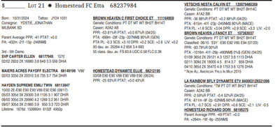Born: 10/31/2024 Tattoo: JY24 1031 Consignor: YDSTIE, JONATHAN MILBANK SD Parent Average PPR: -41 PTAT: +0.0 PA: -432m -21f -15p -246NM$