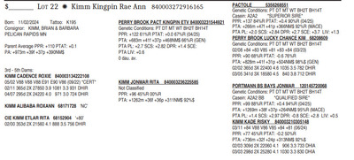 Born: 11/02/2024 Tattoo: K195 Consignor: KIMM, BRIAN & BARBARA PELICAN RAPIDS MN Parent Average PPR: +110 PTAT: +0.1 PA: +973m +39f +37p +390NM$