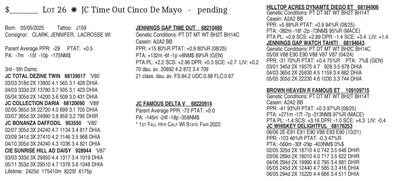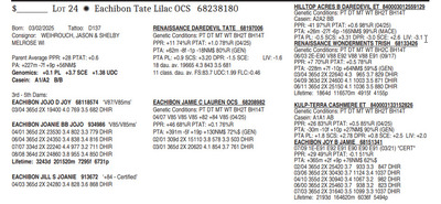 Born: 03/02/2025 Tattoo: D137 Consignor: WEIHROUCH, JASON & SHELBY MELROSE WI Parent Average PPR: +28 PTAT: +0.6 PA: +227m -7f +9p +56NM$ Genomics: +0.1 PL +3.7 SCE +1.38 UDC Casein: A1/A2 B/B