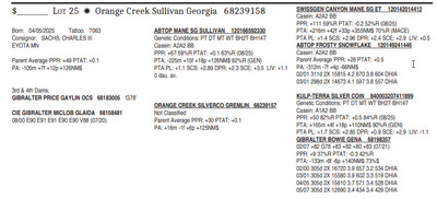 Born: 05/08/2025 Tattoo: P252 Consignor: PIT-CREW GENETICS CAMBRIDGE MN Parent Average PPR: -37 PTAT: +0.3 PA: +137m -20f -9p -220NM$