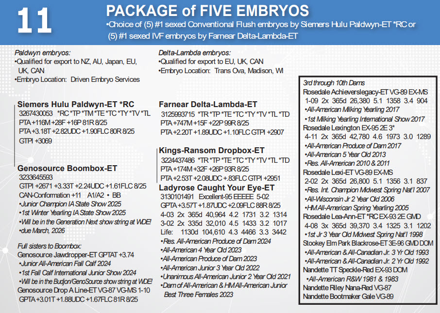 Choice of (5) #1 sexed Conventional Flush embryos by Siemers Hulu Paldwyn-ET *RC or (5) #1 sexed IVF embryos by Farnear D Paldwyn embryos: