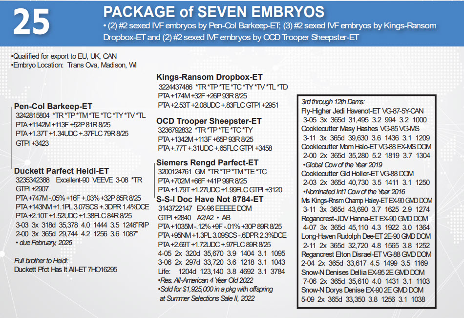 (2) #2 sexed IVF embryos by Pen-Col Barkeep-ET; (3) #2 sexed IVF embryos by Kings-Ransom Dropbox-ET and (2) #2 sexed IVF embryos by OCD Trooper Sheepster-ET Qualified for export to EU, UK, CAN