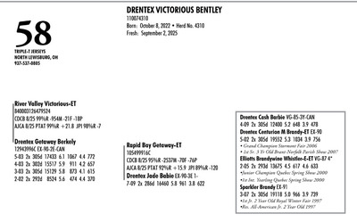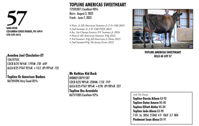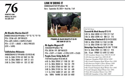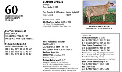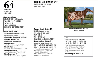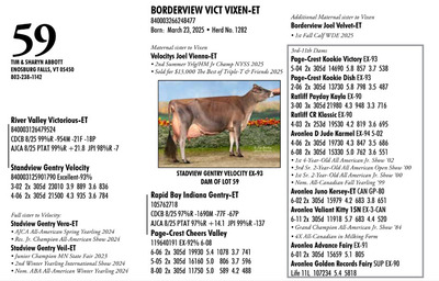 Nittany Lion Fall Classic 2025 800 E. Park Ave, University Park PA, 16802 Great offering of Multiple Breeds! Contact Agent: GW Sebright 717-817-1823 Catalog | Terms of Auction Download CATALOG Download LOT 8 INFO Download SALE ORDER Download UPDATES Catalog | Terms Download CATALOG Download LOT 8 INFO Download SALE ORDER Download UPDATES All Items (135) Cattle (109) Embryos (26) Categories All Items (135) Cattle (109) Embryos (26) Search Item #: Keyword: Search Catalog Item #: Keyword: 20 items per page 50 items per page 100 items per page Go to page #: 2 , 3 , 4 , 5 , 6 , 7 #57 – TOPLINE AMERICAS SWEETHEART 175952871 Excellent-90% Born: August 3, 2022 Fresh: June 7, 2025 Nom. Jr All-American Summer Jr 2-Yr-Old 2024 2nd Summer Jr 2-Yr-Old PNJS 2024 Res. Int Champ Eastern NY Summer Jr 2024 Nom Jr All-American Summer Yrlg 2023 3rd Summer Yrlg All-American Jr Show 2023 2nd SummerYrlg The Jersey Event 2023 Location: 800 E. Park Ave, University Park PA, 16802 Contact Agent: GW Sebright 717-817-1823 More Info / Bid Now Track this Item Sold High Bid: $4,200.00 – #1162 #57 – TOPLINE AMERICAS SWEETHEART Sold High Bid: $4,200 More Details More Info / Bid Track Item 175952871 Excellent-90% Born: August 3, 2022 Fresh: June 7, 2025 Nom. Jr All-American Summer Jr 2-Yr-Old 2024 2nd Summer Jr 2-Yr-Old PNJS 2024 Res. Int Champ Eastern NY Summer Jr 2024 Nom Jr All-American Summer Yrlg 2023 3rd Summer Yrlg All-American Jr Show 2023 2nd SummerYrlg The Jersey Event 2023 Location: 800 E. Park Ave, University Park PA, 16802 Contact Agent: GW Sebright 717-817-1823 #58 – DRENTEX VICTORIOUS BENTLEY 110074310 Born: October 8, 2022 Herd No. 4310 Fresh: September 2, 2025 Location: 800 E. Park Ave, University Park PA, 16802 Contact Agent: GW Sebright 717-817-1823 More Info / Bid Now Track this Item Sold High Bid: $3,600.00 – #1012 #58 – DRENTEX VICTORIOUS BENTLEY Sold High Bid: $3,600 More Details More Info / Bid Track Item 110074310 Born: October 8, 2022 Herd No. 4310 Fresh: September 2, 2025 Location: 800 E. Park Ave, University Park PA, 16802 Contact Agent: GW Sebright 717-817-1823 #59 – BORDERVIEW VICT VIXEN-ET 840003266248477 Born: March 23, 2025 Herd No. 1282 Location: 800 E. Park Ave, University Park PA, 16802 Contact Agent: GW Sebright 717-817-1823 More Info / Bid Now Track this Item Sold High Bid: $2,100.00 – #1237 #59 – BORDERVIEW VICT VIXEN-ET Sold High Bid: $2,100 More Details More Info / Bid Track Item 840003266248477 Born: March 23, 2025 Herd No. 1282 Location: 800 E. Park Ave, University Park PA, 16802 Contact Agent: GW Sebright 717-817-1823 #60 – GLAD RAY LIPSTAIN 175042241 Born: October 1, 2023 Due: December 1, 2025 to Victory Rhondas Big Red-ET (Sexed Semen) 7JE2120 Location: 800 E. Park Ave, University Park PA, 16802 Contact Agent: GW Sebright 717-817-1823 More Info / Bid Now Track this Item Sold High Bid: $3,450.00 – #1162 #60 – GLAD RAY LIPSTAIN Sold High Bid: $3,450 More Details More Info / Bid Track Item 175042241 Born: October 1, 2023 Due: December 1, 2025 to Victory Rhondas Big Red-ET (Sexed Semen) 7JE2120 Location: 800 E. Park Ave, University Park PA, 16802 Contact Agent: GW Sebright 717-817-1823 #61 – GMC ZUMBA DAIRY BAR EXP ET 68335890 Born: June 10, 2025 Location: 800 E. Park Ave, University Park PA, 16802 Contact Agent: GW Sebright 717-817-1823 More Info / Bid Now Track this Item Sold High Bid: $3,000.00 – #13 #61 – GMC ZUMBA DAIRY BAR EXP ET Sold High Bid: $3,000 More Details More Info / Bid Track Item 68335890 Born: June 10, 2025 Location: 800 E. Park Ave, University Park PA, 16802 Contact Agent: GW Sebright 717-817-1823 #62 – BLUEROCK 1776 NEW YORK FIRE 68334550 Born: September 2, 2024 Location: 800 E. Park Ave, University Park PA, 16802 Contact Agent: GW Sebright 717-817-1823 More Info / Bid Now Track this Item Sold High Bid: $2,100.00 – #88 #62 – BLUEROCK 1776 NEW YORK FIRE Sold High Bid: $2,100 More Details More Info / Bid Track Item 68334550 Born: September 2, 2024 Location: 800 E. Park Ave, University Park PA, 16802 Contact Agent: GW Sebright 717-817-1823 #63 – KNAPPS REPUTATION BLENDA-ETV 840003262439661 Pending Born: December 4, 2024 Location: 800 E. Park Ave, University Park PA, 16802 Contact Agent: GW Sebright 717-817-1823 More Info / Bid Now Track this Item Sold High Bid: $2,650.00 – #1161 #63 – KNAPPS REPUTATION BLENDA-ETV Sold High Bid: $2,650 More Details More Info / Bid Track Item 840003262439661 Pending Born: December 4, 2024 Location: 800 E. Park Ave, University Park PA, 16802 Contact Agent: GW Sebright 717-817-1823 #64 – TOPGUN SLIP RE WHEN WET 840003010393 97.01% Ayrshire Born: July 10, 2024 Location: 800 E. Park Ave, University Park PA, 16802 Contact Agent: GW Sebright 717-817-1823 More Info / Bid Now Track this Item Sold High Bid: $1,900.00 – #1237 #64 – TOPGUN SLIP RE WHEN WET Sold High Bid: $1,900 More Details More Info / Bid Track Item 840003010393 97.01% Ayrshire Born: July 10, 2024 Location: 800 E. Park Ave, University Park PA, 16802 Contact Agent: GW Sebright 717-817-1823 #65 – JLT HULU FOXY LADY-RED 840003272239770 99%RHA-I Born: December 8, 2024 Herd No. 770 Location: 800 E. Park Ave, University Park PA, 16802 Contact Agent: GW Sebright 717-817-1823 More Info / Bid Now Track this Item Sold High Bid: $2,700.00 – #35 #65 – JLT HULU FOXY LADY-RED Sold High Bid: $2,700 More Details More Info / Bid Track Item 840003272239770 99%RHA-I Born: December 8, 2024 Herd No. 770 Location: 800 E. Park Ave, University Park PA, 16802 Contact Agent: GW Sebright 717-817-1823 #66 – CHERRY-KV HULU RAISINET 840003286310601 99%RHA-I *RC Born: January 28, 2025 Herd No. 984 Location: 800 E. Park Ave, University Park PA, 16802 Contact Agent: GW Sebright 717-817-1823 More Info / Bid Now Track this Item Sold High Bid: $3,250.00 – #88 #66 – CHERRY-KV HULU RAISINET Sold High Bid: $3,250 More Details More Info / Bid Track Item 840003286310601 99%RHA-I *RC Born: January 28, 2025 Herd No. 984 Location: 800 E. Park Ave, University P