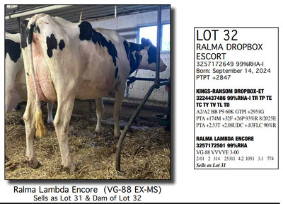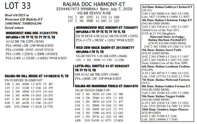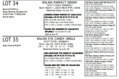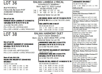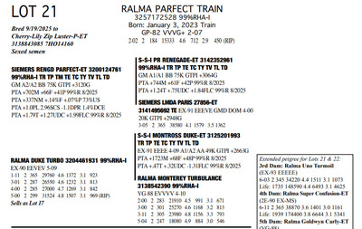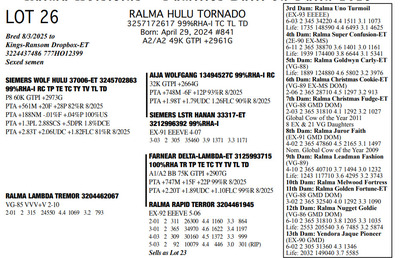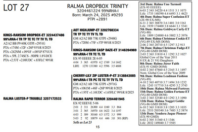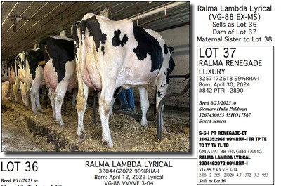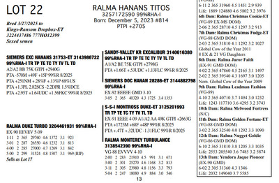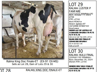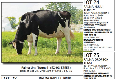 FAMILIES BUILT ON FAITH 16699 25th Ave NW , Rice MN, 56367 Great offering of genetics... Contact Agent: Aaron Ray Tompkins 336-363-4639 Catalog | Terms of Auction Download CATALOG Download SALE ORDER Download UPDATES Download ADDED LOT 175 Catalog | Terms Download CATALOG Download SALE ORDER Download UPDATES Download ADDED LOT 175 All Items (184) Cattle (184) Categories All Items (184) Cattle (184) Search Item #: Keyword: Search Catalog Item #: Keyword: 20 items per page 50 items per page 100 items per page Go to page #: 1 , 2 , 3 , 4 , 5 , 6 #21 – RALMA PARFECT TRAIN 3257172528 99%RHA-I Born: January 3, 2023 Train GP-82 VVVG+ 2-07 2-02 2 184 15333 4.6 712 2.9 450 (RIP) Bred 9/19/2025 to Cherry-Lily Zip Luster-P-ET 3138843085 7HO14160 Sexed semen Location: 16699 25th Ave NW , Rice MN, 56367 Contact Agent: Aaron Ray Tompkins 336-363-4639 More Info / Bid Now Track this Item Sold High Bid: $4,250.00 – #10 #21 – RALMA PARFECT TRAIN Sold High Bid: $4,250 More Details More Info / Bid Track Item 3257172528 99%RHA-I Born: January 3, 2023 Train GP-82 VVVG+ 2-07 2-02 2 184 15333 4.6 712 2.9 450 (RIP) Bred 9/19/2025 to Cherry-Lily Zip Luster-P-ET 3138843085 7HO14160 Sexed semen Location: 16699 25th Ave NW , Rice MN, 56367 Contact Agent: Aaron Ray Tompkins 336-363-4639 #22 – RALMA HANANS TITOS 3257172590 99%RHA-I Born: December 5, 2023 #814 PTPI +2705 Bred 3/27/2025 to Kings-Ransom Dropbox-ET 3224437486 777HO12399 Sexed semen Location: 16699 25th Ave NW , Rice MN, 56367 Contact Agent: Aaron Ray Tompkins 336-363-4639 More Info / Bid Now Track this Item Sold High Bid: $4,300.00 – #47 #22 – RALMA HANANS TITOS Sold High Bid: $4,300 More Details More Info / Bid Track Item 3257172590 99%RHA-I Born: December 5, 2023 #814 PTPI +2705 Bred 3/27/2025 to Kings-Ransom Dropbox-ET 3224437486 777HO12399 Sexed semen Location: 16699 25th Ave NW , Rice MN, 56367 Contact Agent: Aaron Ray Tompkins 336-363-4639 #23 – RALMA RAPID TERROR 3204461945 100%RHA-I Born: February 18, 2020 Terror EX-92 EEEVE 5-06 2-01 2 311 26300 4.4 1160 3.3 864 3-01 2 365 34970 4.6 1622 3.4 1197 4-03 2 309 30160 4.5 1372 3.3 999 5-03 2 92 10079 4.4 446 3.0 301 (RIP) Bred 8/25/2025 to Kings-Ransom Dropbox-ET 3224437486 777HO12399 Sexed semen Location: 16699 25th Ave NW , Rice MN, 56367 Contact Agent: Aaron Ray Tompkins 336-363-4639 More Info / Bid Now Track this Item Sold High Bid: $5,300.00 – #26 #23 – RALMA RAPID TERROR Sold High Bid: $5,300 More Details More Info / Bid Track Item 3204461945 100%RHA-I Born: February 18, 2020 Terror EX-92 EEEVE 5-06 2-01 2 311 26300 4.4 1160 3.3 864 3-01 2 365 34970 4.6 1622 3.4 1197 4-03 2 309 30160 4.5 1372 3.3 999 5-03 2 92 10079 4.4 446 3.0 301 (RIP) Bred 8/25/2025 to Kings-Ransom Dropbox-ET 3224437486 777HO12399 Sexed semen Location: 16699 25th Ave NW , Rice MN, 56367 Contact Agent: Aaron Ray Tompkins 336-363-4639 #24 – RALMA HULU TERRIFY 3257172625 99%RHA-I Born: June 1, 2024 #849 PTPI +2823 Bred 8/18/2025 to Kings-Ransom Dropbox-ET 3224437486 777HO12399 Sexed semen Location: 16699 25th Ave NW , Rice MN, 56367 Contact Agent: Aaron Ray Tompkins 336-363-4639 More Info / Bid Now Track this Item Sold High Bid: $4,100.00 – #38 #24 – RALMA HULU TERRIFY Sold High Bid: $4,100 More Details More Info / Bid Track Item 3257172625 99%RHA-I Born: June 1, 2024 #849 PTPI +2823 Bred 8/18/2025 to Kings-Ransom Dropbox-ET 3224437486 777HO12399 Sexed semen Location: 16699 25th Ave NW , Rice MN, 56367 Contact Agent: Aaron Ray Tompkins 336-363-4639 #25 – RALMA DROPBOX TENSE 3313474525 99%RHA Born: June 11, 2025 #Y-5 PTPI +2885 Location: 16699 25th Ave NW , Rice MN, 56367 Contact Agent: Aaron Ray Tompkins 336-363-4639 More Info / Bid Now Track this Item Sold High Bid: $3,900.00 – #54 #25 – RALMA DROPBOX TENSE Sold High Bid: $3,900 More Details More Info / Bid Track Item 3313474525 99%RHA Born: June 11, 2025 #Y-5 PTPI +2885 Location: 16699 25th Ave NW , Rice MN, 56367 Contact Agent: Aaron Ray Tompkins 336-363-4639 #26 – RALMA HULU TORNADO 3257172617 99%RHA-I TC TL TD Born: April 29, 2024 #841 A2/A2 49K GTPI +2961G Bred 8/3/2025 to Kings-Ransom Dropbox-ET 3224437486 777HO12399 Sexed semen Location: 16699 25th Ave NW , Rice MN, 56367 Contact Agent: Aaron Ray Tompkins 336-363-4639 More Info / Bid Now Track this Item Sold High Bid: $4,000.00 – #1061 #26 – RALMA HULU TORNADO Sold High Bid: $4,000 More Details More Info / Bid Track Item 3257172617 99%RHA-I TC TL TD Born: April 29, 2024 #841 A2/A2 49K GTPI +2961G Bred 8/3/2025 to Kings-Ransom Dropbox-ET 3224437486 777HO12399 Sexed semen Location: 16699 25th Ave NW , Rice MN, 56367 Contact Agent: Aaron Ray Tompkins 336-363-4639 #27 – RALMA DROPBOX TRINITY 3204461224 99%RHA-I Born: March 24, 2025 #9293 PTPI +2891 Location: 16699 25th Ave NW , Rice MN, 56367 Contact Agent: Aaron Ray Tompkins 336-363-4639 More Info / Bid Now Track this Item Sold High Bid: $3,100.00 – #19 #27 – RALMA DROPBOX TRINITY Sold High Bid: $3,100 More Details More Info / Bid Track Item 3204461224 99%RHA-I Born: March 24, 2025 #9293 PTPI +2891 Location: 16699 25th Ave NW , Rice MN, 56367 Contact Agent: Aaron Ray Tompkins 336-363-4639 #28 – RALMA KING DOC FINALE-ET 3204461989 99%RHA-I Born: August 1, 2020 Finale EX-91 EEVEE 5-00 2-00 2 365 31980 3.3 1041 2.8 903 3-02 2 365 39530 3.6 1407 2.8 1099 4-04 2 259 32551 4.0 1289 2.6 858 (RIP) Bred 2/12/2025 to Kings-Ransom Dropbox-ET 3224437486 777HO12399 Sexed semen Location: 16699 25th Ave NW , Rice MN, 56367 Contact Agent: Aaron Ray Tompkins 336-363-4639 More Info / Bid Now Track this Item Sold High Bid: $3,900.00 – #37 #28 – RALMA KING DOC FINALE-ET Sold High Bid: $3,900 More Details More Info / Bid Track Item 3204461989 99%RHA-I Born: August 1, 2020 Finale EX-91 EEVEE 5-00 2-00 2 365 31980 3.3 1041 2.8 903 3-02 2 365 39530 3.6 1407 2.8 1099 4-04 2 259 32551 4.0 1289 2.6 858 (RIP) Bred 2/12/2025 to Kings-Ransom Dropbox-ET 3224437486 777HO12399 Sexed semen Location: 16699 25th Ave NW , Rice MN, 56367 Contact Agent: Aaron Ray T